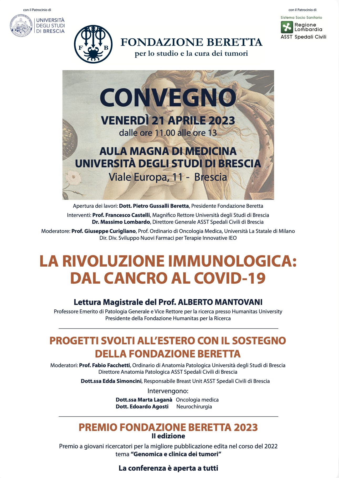La Fondazione Beretta per lo studio e la cura dei tumori, con l’Università degli Studi di Brescia, organizza per sabato 25 giugno un convegno, all’interno del quale si inseriranno l’intervento del prof. Pier Paolo Di Fiore “Cellule staminali e cancro”, la presentazione dei progetti esteri svolti con il sostegno della Fondazione e il Premio Fondazione Beretta 2022 – Ia edizione.